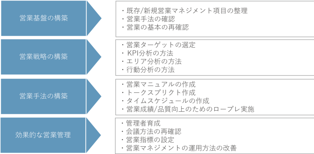 特に、個々の人材の成長を軸とした育成計画、及び研修プログラムを構築することでサスティナブルな営業力向上環境を実現致します。