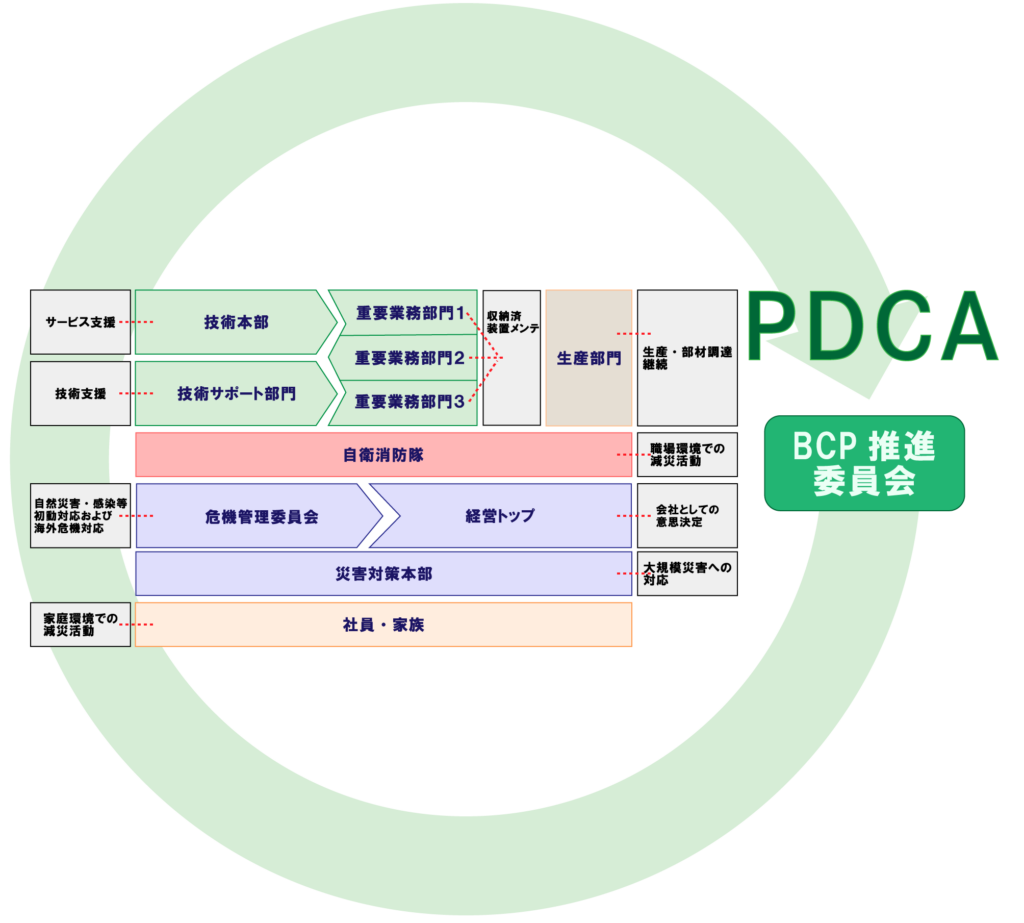 お客様の企業防衛対策のメインテナンスをご支援します。どんなに良くできた防衛計画・防衛体制が揃っていたとしても、時間の経過と共に計画は陳腐化し、体制は綻びができ、人の心には緩みが生じます。企業防衛隊は、危機の起こっていない平時から、お客様の企業防衛対策のパフォーマンス管理をご支援いたします(図はBCPの事例)